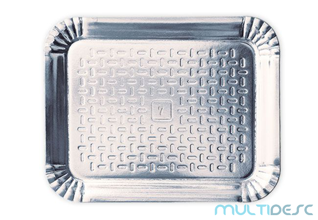 Bandeja Retangular feita de papelão laminado na cor prata.